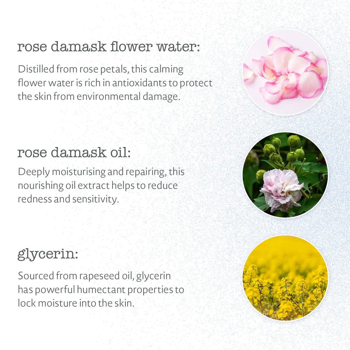 Rose Damask Oil: Deeply moisturising and repairing, this nourishing oil extract reduces redness and sensitivity.